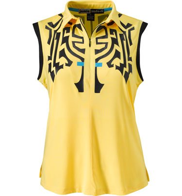 Jamie Sadock Womens Sleeveless Aztec Print Zip Polo The Jamie Sadock Womens Sleeveless Aztec Print Zip Polo features a black, contrasting Aztec design on a yellow background and is accented with complimentary blue. The pattern continues on the back, and the moisture-wicking properties of the fabric pulls moisture away from the skin to the outer surface for quicker evaporation, leaving dry and comfortable. Additional features: 92% polyester/8% spandex Cooltron fabric Sleeveless Concealed zipper placket Self-fabric collar Split hem Easy care Machine wash